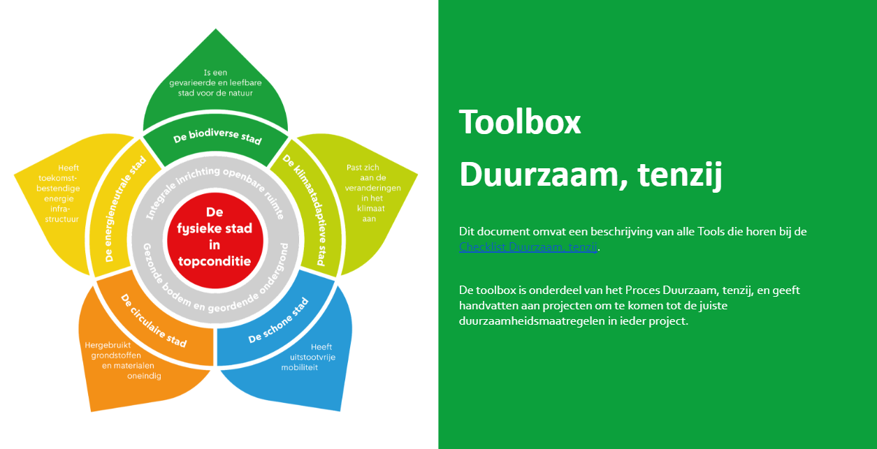 Vervolgens gaat Anne Uildriks (tijdcode 00:22:39) dieper in op de Toolbox en Checklist zelf. Er zitten veel tools in die anderen ook zouden kunnen gebruiken, vertelt ze, en ze laat er een paar zien. Het document is 30 pagina's lang met ongeveer 70 tools voor de thema's klimaatadaptatie, schone lucht, energie, ondergrond, circulariteit, biodiversiteit en integraliteit. Het biedt een handig overzicht per projectfase en een tijdsinschatting per tool, zodat projectleiders er snel mee aan de slag kunnen.